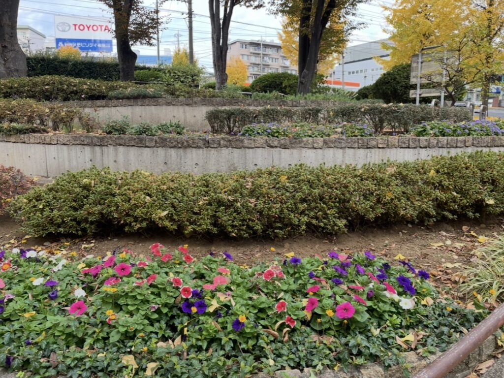 遊具などが設置されていないため、小さなお子さまが遊ぶ場所としては限られますが、手入れされた花壇や植栽スペースがあり、花々や緑が訪れる人の目を楽しませてくれます。